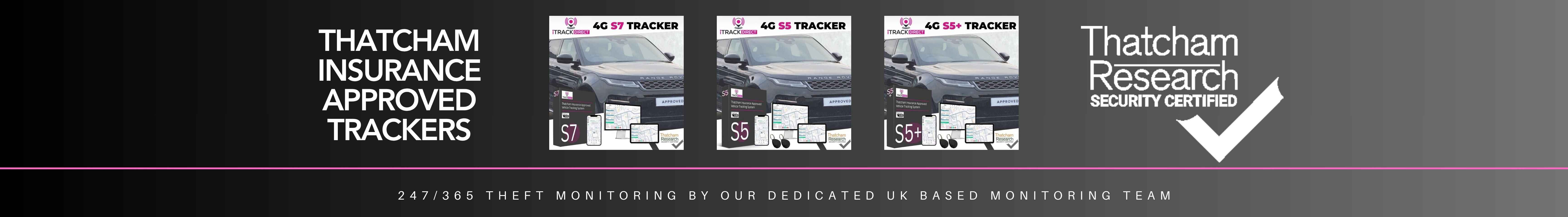 There are three main categories for Thatcham Insurance Approved Car Trackers. The S7, S5 and S5 Plus, all offering 24/7 theft monitoring:
